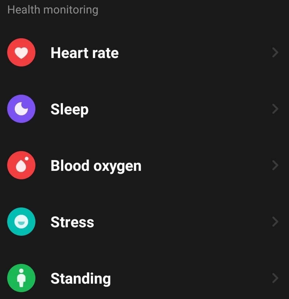 Ayrıca ayarlayabilirsinizSağlık İzlemeUygulama üzerinden kalp atış hızı, uyku, kan oksijeni, stres izleme ve daha fazlası dahil olmak üzere ayarlar. Döneminizi izlemek için ayrı bir uygulama kullanmaktan hoşlanmıyorsanız, artık bunu sizin için yapmak için MI Fitness uygulamasını kullanabilirsiniz. Ayrıca, boş bir uyarıyı etkinleştirmek için bir seçenek var - bir saatten fazla hareket etmediğinizi algılayıp hareket ettirmeye teşvik ederse saat titreyecektir.