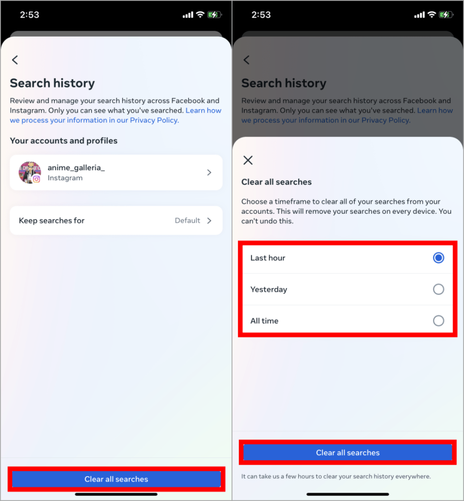 Bunu yapmak için Instagram ayarlarınıza gidin ve “Gizlilik” bölümüne gidin. Oradan “Arama Geçmişi” ye dokunun ve “Arama Geçmişini Temizle” yi seçin. Instagram daha sonra, son saat, dün tüm tarih olsun, arama geçmişinizi temizlemek için bir zaman çerçevesi seçme seçeneği sunacaktır.
