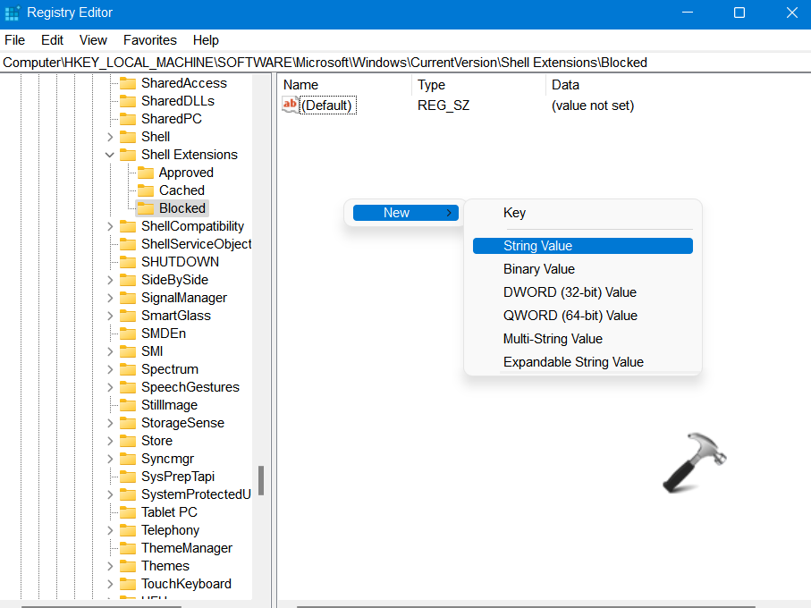 4.Şimdi yeniden adlandırınEngellenmiş. Yapıldıktan sonra, herhangi bir boş alana sağ tıklayın ve bir dize değeri oluşturun. Bunun için seçinYeniVe sonra seçSicim Value.