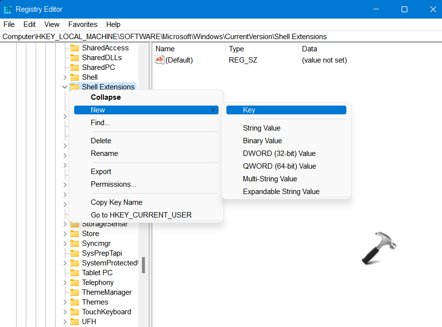 3.Bir kez orada, kabuk uzantıları altında yeni bir anahtar oluşturun. Bunun için sağ tıklayınKabuk uzantılarıve seçYenive daha sonra,AnahtarBağlam menüsünden.