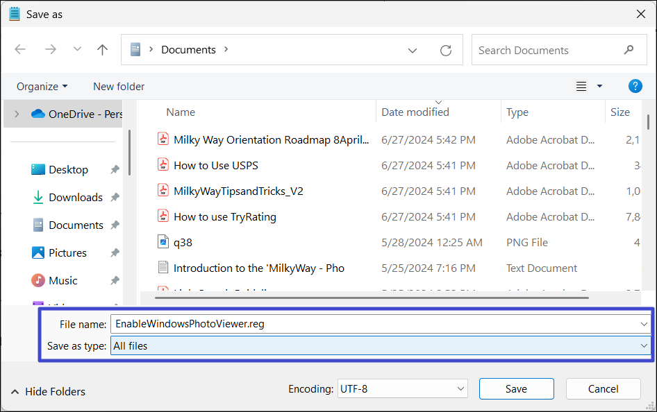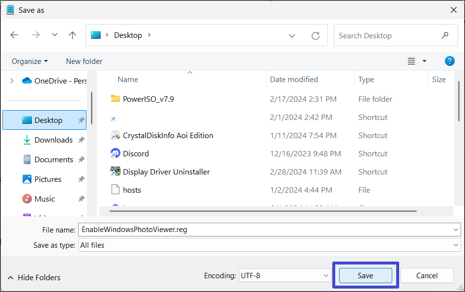 3. Dosyayı “EnableWindowsphotoviewer.reg."O zaman seçtiğinizden emin olun"Tüm dosyalar (.)"Tür Olarak Kaydetaçılır menü.