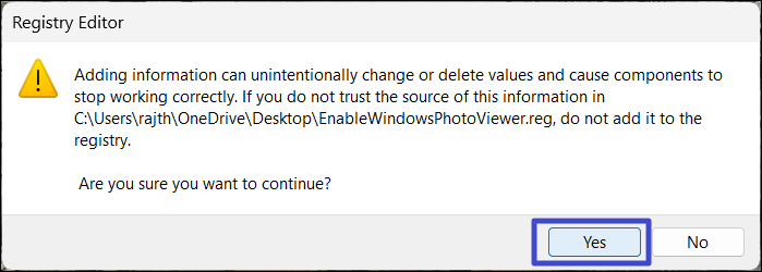 4. Çift tıklayınDisableWindowsphotoviewer.regkurtardığın yerden. Sonra tıklayın “Evet”Onaylamak için.