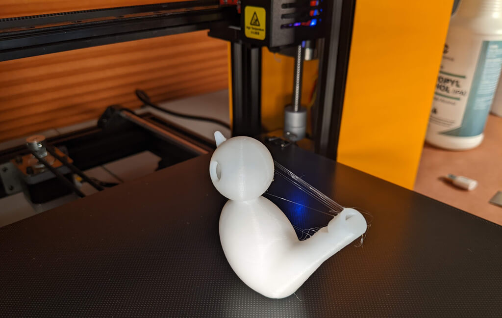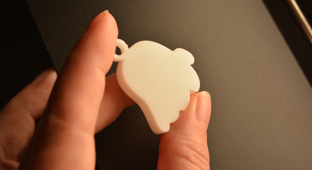 Önce en basit test modelini - MicroSD karttaki hayalet modeli - yazıcı ile birlikte gelen PLA filamanı ile yazdırmaya karar verdik. Oldukça küçüktü ve yaklaşık yirmi dakika içinde bitti. Hayaletin yanları ve üstü iyi görünüyordu. Herhangi bir kusur veya telleme görmedik.