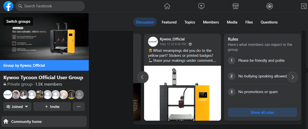 Son olarak,Kywoo Tycoon Resmi Kullanıcı GrubuFacebook'ta oldukça aktif ve sahip olabileceğiniz sorunları gidermeye yardımcı olmak isteyen kullanıcılar ve uzmanlarla doludur.