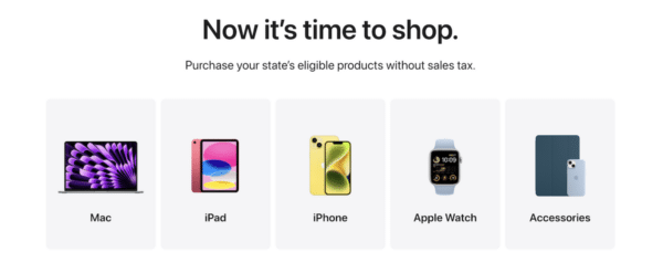 Satış Vergisi Tatili 2023 için Apple, tüketicilerin ABD'de on eyalette satış vergisi olmadan satın almaları için belirli ürünler sunar.