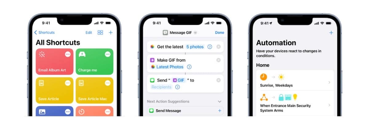 İPhone ve iPad'de, Kısayollar uygulaması, kullanıcıların uygulamalarla yapılan bir veya daha fazla görevi almak için hızlı bir kısayol oluşturmasına olanak tanır. Kullanıcılar, internette uygulamalar ve içerik ve içerik ve hizmet ile etkileşime giren kısayollar oluşturmak için bir eylem kullanabilir ve bir otomasyon kısayolu, “geldiğinizde veya ayrıldığınızda, iPhone'unuzda bir ayarı, gün içinde ve çok daha fazlasını değiştirdiğinizde otomatik kısayol çalıştırması” için bir etkinlik tarafından tetiklenir.