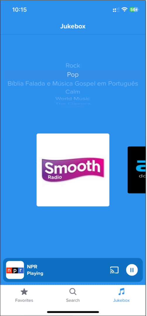 Birçok radyo istasyonunu dinleyebilmenize rağmen, müzik dinlemek istiyorsanız Jukebox özelliğini kontrol edebilirsiniz. Pop, rock, ülke, Latin ve diğerleri gibi farklı türler mevcuttur. Türü seçtikten sonra, bu türde bulunan çeşitli kanallar arasından seçim yapabilirsiniz. Ayrıca, ses kalitesi bir radyo müzik kutusu için uygundur. Ayrıca, bu uygulamayı iPhone'unuzdan Google TV, Chromecast veya Döküm'i destekleyen cihazlara kullanabilirsiniz.