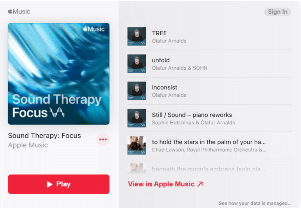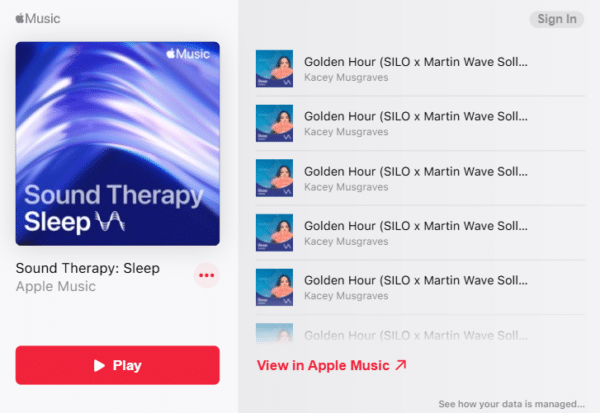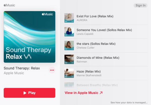 Sound Therapy, Katy Perry, Imagine Dragons, Kacey Musgraves, Ludovico Einaudi, Aurora, Jhené Aiko, Chelsea Cutler ve Jeremy Zucker gibi sanatçıların popüler şarkılarının yeniden tasarlanmış versiyonlarını sunuyor. Katy Perry'nin özellikle sürüklenmenize yardımcı olmak için tasarlanmış “Double Rainbow” ın rüya gibi, enstrümantal bir şekilde ele alındığını veya konsantrasyonu arttırmak için yeniden işlenen bir Imagine Dragons pisti hayal edin.