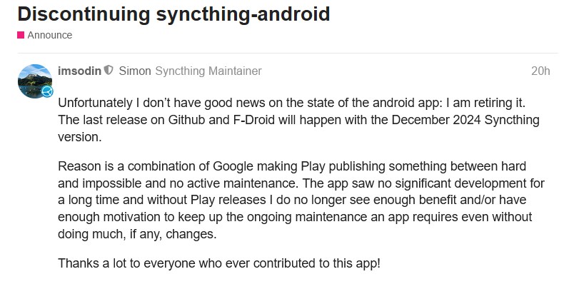 Kullanıcılar uygulamanın GitHub ve F-Droid üzerinden neden var olmaya devam edemeyeceğini sormuşlardı ve başka bir koruyucu, Syncthing'in mobil uygulamasının geliştirilmesinin durgun olduğunu ve uzun zamandır yaşam desteğinde olduğunu açıkladı.