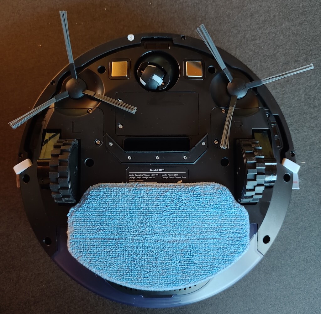Robovac'ın altında, her iki tarafta iki tahrik tekerleği vardır ve evrensel bir tekerlek önündedir. İlk kullanımdan önce, iki yan fırçayı G20 robot vakumunuza takmalısınız. Altında, pastandan kolayca ayrılabilen paspas pedini bulacaksınız.