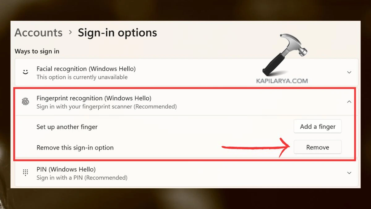 2. Listeden Windows Hello Parmak İzini seçin ve ardından tüm parmak izlerinizi silmek için “Kaldır” a basın.