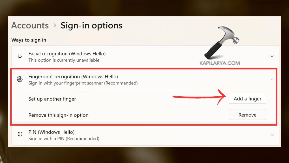 2. Windows Hello Parmak İzini öğrenin ve ardından bu seçenek altında başka bir tane eklemek için bir talimat olacaktır.