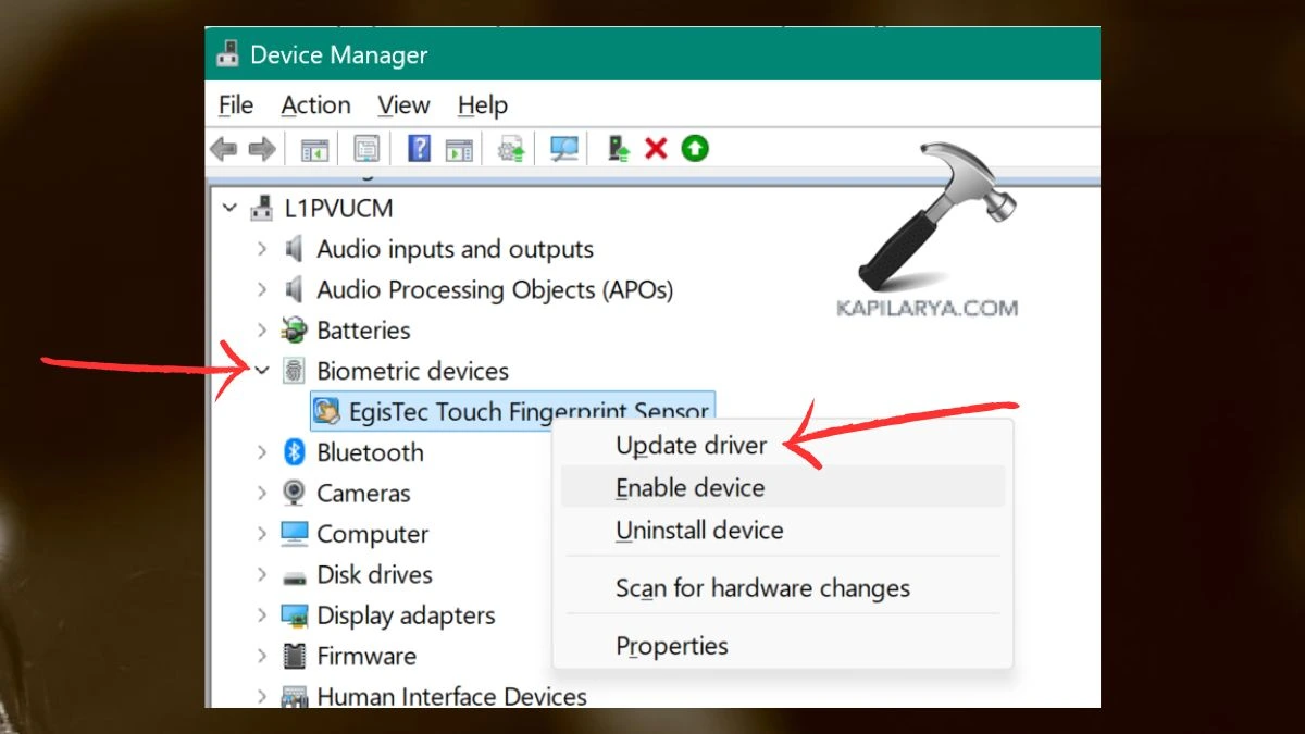 Cihaz Yöneticisi'ndeki biyometrik sürücüleri güncelleyin