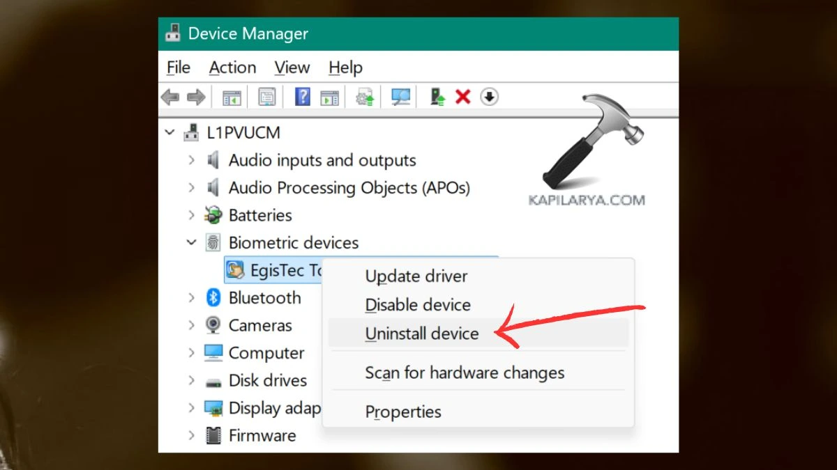 2. Biyometrik aygıtlarda> parmak izi sensöründe sağ tıklayın ve “Aygıtı Kaldır” ı seçin. Kaldırma işlemini kontrol edin ve bilgisayarınızı yeniden başlatın.