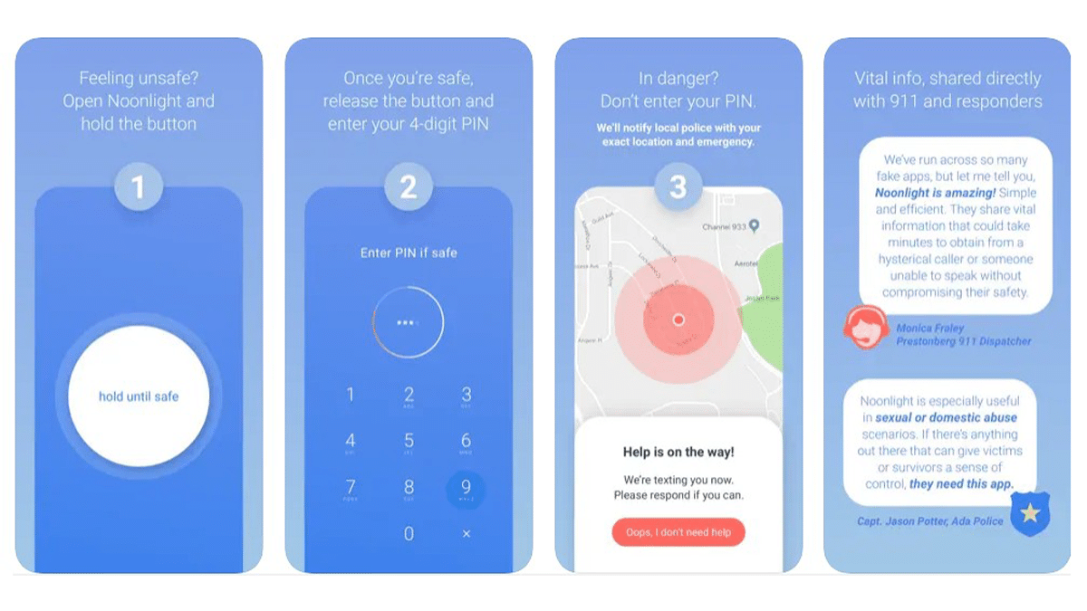 Noonlight, güvensiz hissettiğinizde veya acil bir durum olduğunda kişisel güvenlik sağlar. Bir düğmenin yayınlanmasıyla kullanıcının kesin konumunda acil durum personelini uyarmak için gelişmiş teknolojiye ve güvenli olmayan durumlar için kullanımı kolay bir “ölü adamın anahtarı”, kullanıcı güvenli olduğunu onaylamak için bir düğmeye basabilir ve tutabilir ve kullanıcılar kullanıcının kullanıcıya girmeden önce düğmeyi bırakmasına izin verirse bir yanıt tetiklenebilir.