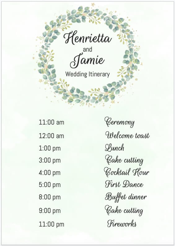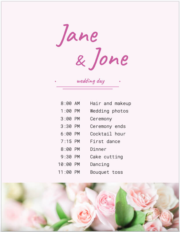 Belki de bütün bir hafta sonu yerine büyük bir gün için bir güzergah tercih edersiniz. Bu güzel çiçek düğün güzergahı şablonu hazırlanır ve resepsiyonda buket atışı ile biter. Bu güzel güzergahı gelin partinize gönderebilir veya yazdırabilir ve dağıtabilirsiniz.