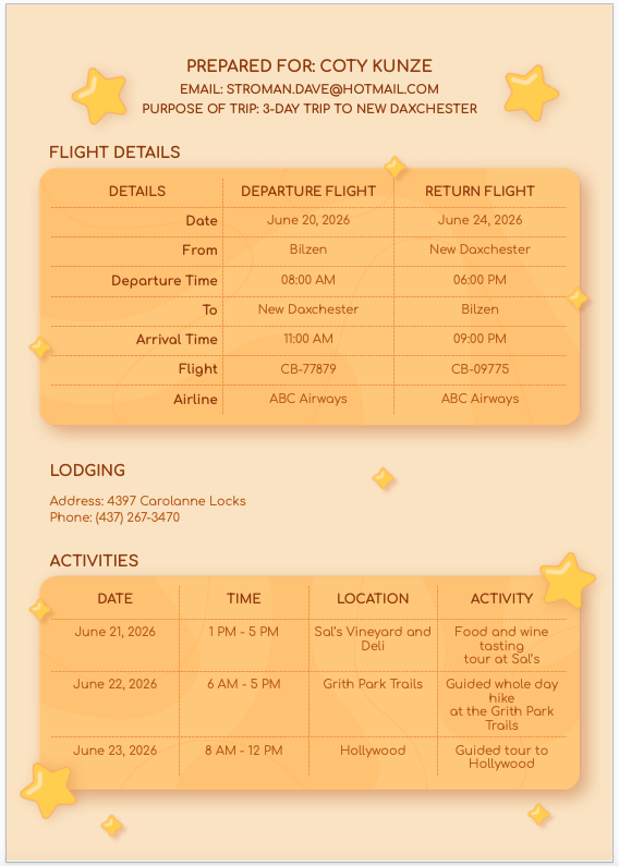 Bunun yerine tatilinizde sıcak bir yere gidiyorsanız, bu sarı ve turuncu güneşli güzergah şablonu sadece ihtiyacınız olan şeydir. Uçuş ayrıntılarınızı ayrılış ve iade, konaklama bilgileriniz ve ardından her gün için saatler ve yerlerle aktiviteler için girin.