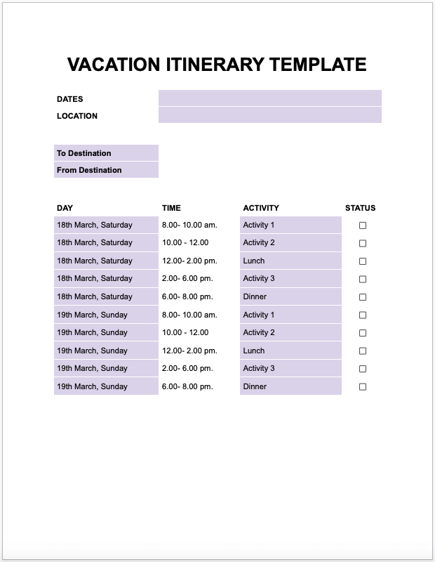 Google Dokümanlar için çekici, ücretsiz bir şablonla tatil, gezi, partinizi veya etkinliğinizi düzenleyin. Bu seçenekler size programınızı gün geçtikçe planlamak için ihtiyacınız olan temel bilgileri verir ve ihtiyaçlarınıza uyacak şekilde özelleştirilebilir.