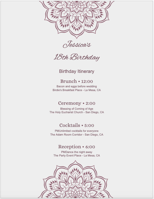 Bu doğum günü güzergahı şablonu, partiniz için her şeyi düzenli tutmak için müthiş. Öğle yemeğiyle başlayın, havuz partisine geçin ve içecek ve kulüp ekleyin. Ayrıca şablonu kendi parti faaliyetleriniz için tamamen özelleştirebilirsiniz.