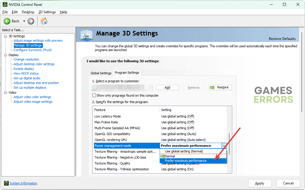 - Gidip gelmek3D Ayarları Yönetinve tıklayınProgram Ayarları.