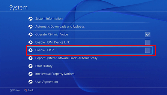 Yüksek bant genişliği dijital içerik koruması, PS4'te dijital içerik korsanlığının önlenmesine yardımcı olan bir protokoldür. Ancak, monitörünüz, TV veya başka bir ekran cihazı HDCP özelliği ile uyumsuz olabilir. Eğer öyleyse, sonuç siyah bir ekran olacaktır. Böylece, sorun olup olmadığını görmek için HDCP özelliğini kapatmayı deneyebilirsiniz. İşte nasıl: