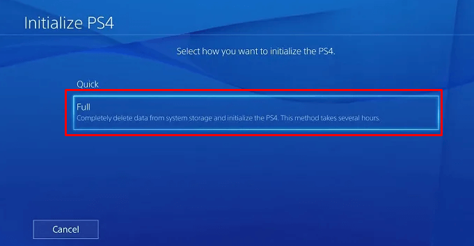 - Bir sonraki ekranda,Tam doluseçenek. Bu, PS4 sistem depolamasını tamamen silecektir.