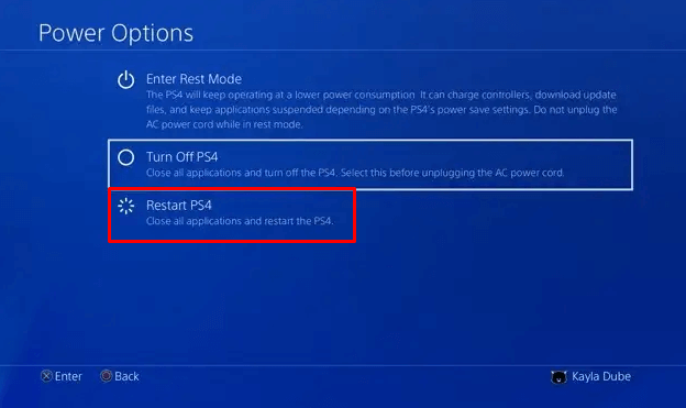 - Güç Seçenekleri menüsü göründüğünde seçinPS4'ü yeniden başlatın.