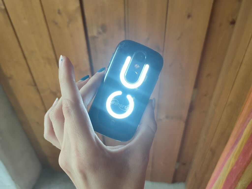Telefonu ters çevirdiğinizde, önde gelen bir Unihertz logosuyla yarı saydam bir geri göreceksiniz. Tek bir kamera lensi, flaş ve şık metalik kaplamalı bir parmak izi sensörü var. Parmak izi sensörü ve Unihertz logosu iki küçük ama parlak LED şeritlerle çevrilidir.