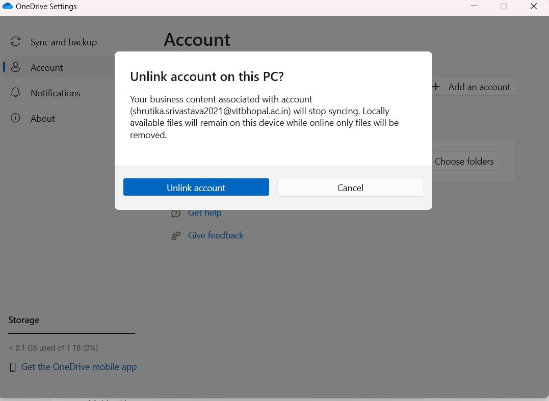 - OneDrive'ı kaldırma konusunda eminseniz, “UNLINTING hesabı” düğmesine tıklayın.