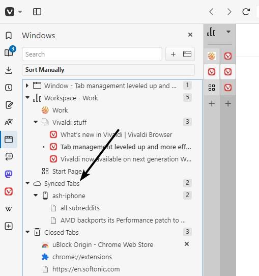 Tarayıcıdaki Windows paneli artık bağlı cihazlarınızda açık olan sekmeleri vurgulamaktadır. Bunu kullanmak için bir Vivaldi hesabına ihtiyacınız olacak, oturum açacak ve her iki cihazda senkronizasyon etkinleştireceksiniz. PC'nizdeki Windows paneline eriştiğinizde, Vivaldi, telefonunuz veya dizüstü bilgisayarınız gibi diğer cihazınızda açılan sekmeleri “Senkronizasyon sekmeleri” olarak etiketlenmiş ayrı bir kategoride listeleyecektir. Her cihazın kendi iç içe ağaç yapısı vardır. Doğrudan bilgisayarınızda erişmek için bir sekmeye tıklayın. Bağlantıyı kopyalamak veya yer imlerine eklemek için senkronize bir sekmeye sağ tıklayabilirsiniz, ancak PC'den bir sekmeyi kapatamazsınız.