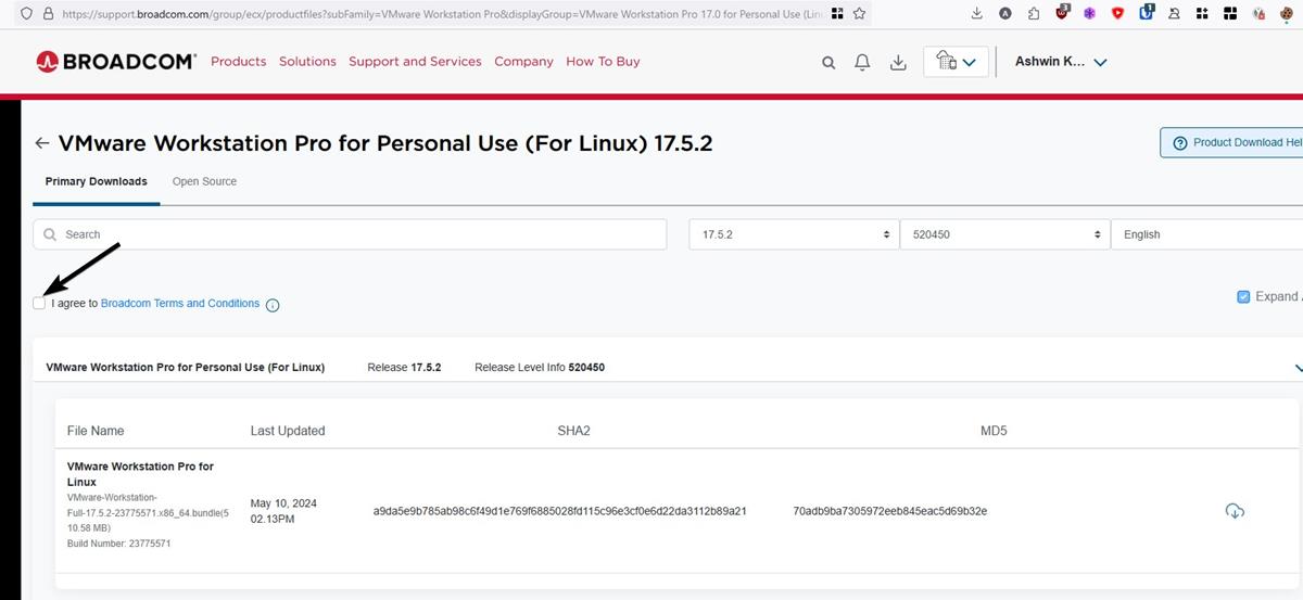 “Kişisel kullanım için VMware Workstation Pro 17” ye tıklamanız gerekir. İşletim sisteminiz, yani Windows veya Linux için uygun sürümü seçin. En son sürüm numarasına tıklayın. Web sayfasında, hüküm ve koşulları kabul etmek için işaretlemeniz gereken bir onay kutusu görüntüleyecektir. Bu, VMware Workstation Pro 17'yi indirmenize olanak tanır. Bunu yapmak için Bulut düğmesine tıklayın ve dosyanız anlık olarak indirilmelidir.
