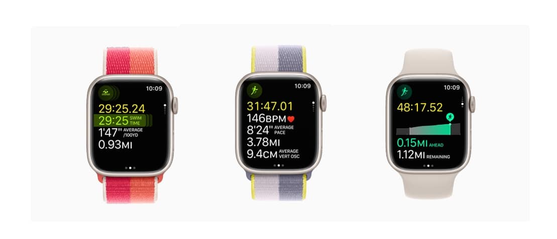 - Watchos 9'daki fitness+ egzersizler, abonelerin bisiklete binmek için kürek veya dakikada (RPM) için dakikada stroklar (SPM) gibi egzersizlerinden en iyi şekilde yararlanmalarına yardımcı olmak için ekran rehberliği gösterecektir.