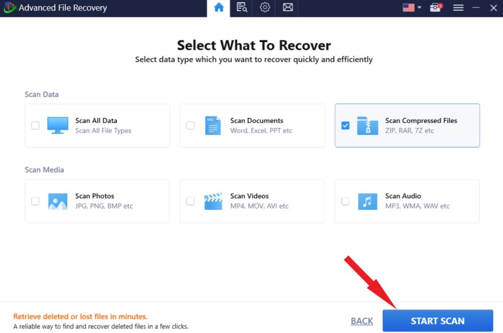 4. Adım:Şimdi kutuyu işaretle 'Sıkıştırılmış dosyaları tarayın 'Ve tıklayınTaramaya Başladüğme.