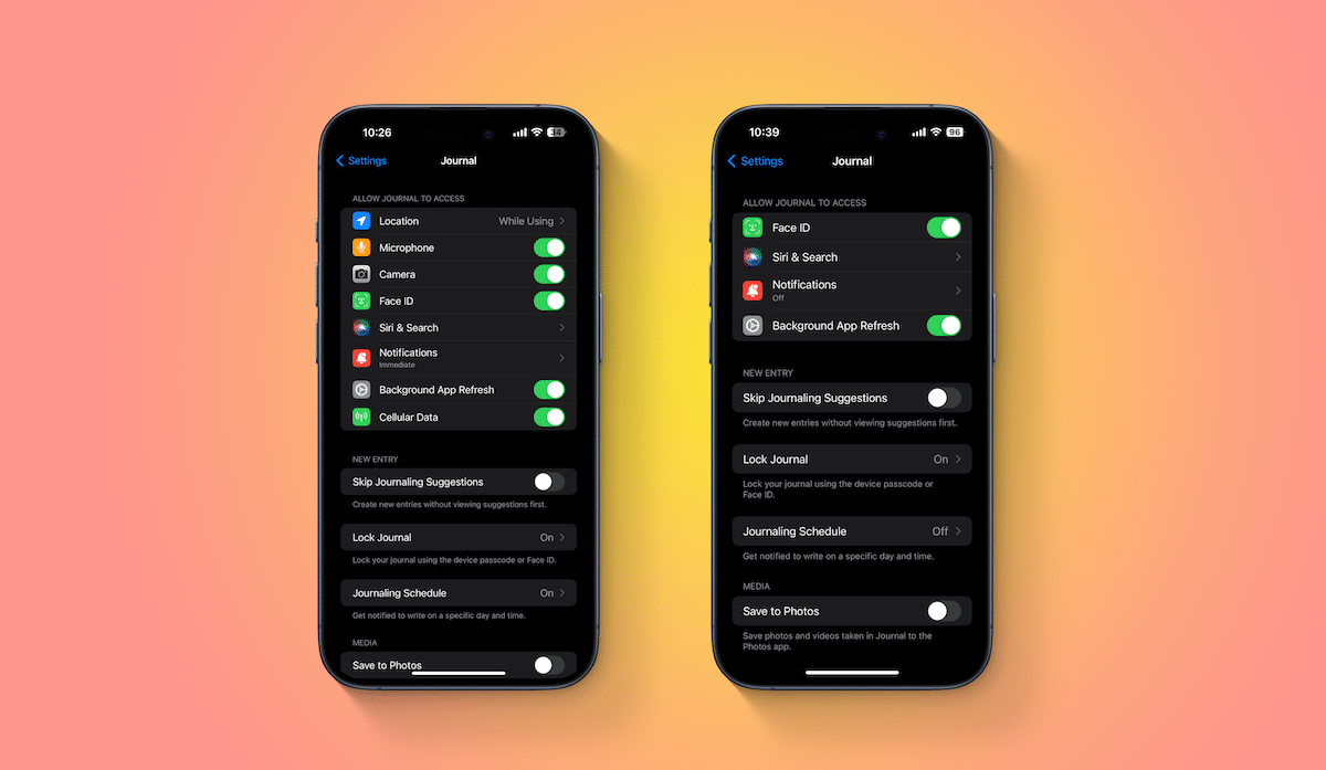 Ayarlar uygulamasında, Jounral uygulamasının FaceID, Media ve Apple Müzik, Bildirimler, Kamera ve Hücresel Verilere erişmesi için yeni ayarlar vardır. Daha önce, uygulamada yalnızca Siri & Search, FaceID, Arka Plan Uygulaması Erişim bölümünde yenileme seçenekleri vardı.