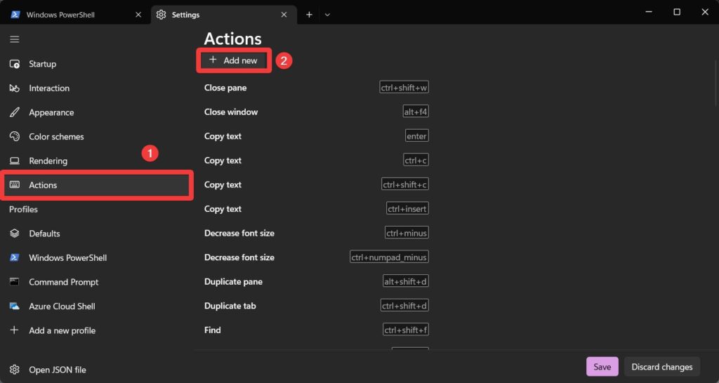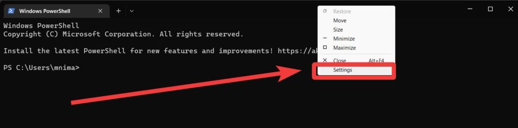 1. adım: Windows PowerShell'i açın ve ayarları açmak için sekmesine sağ tıklayın.
