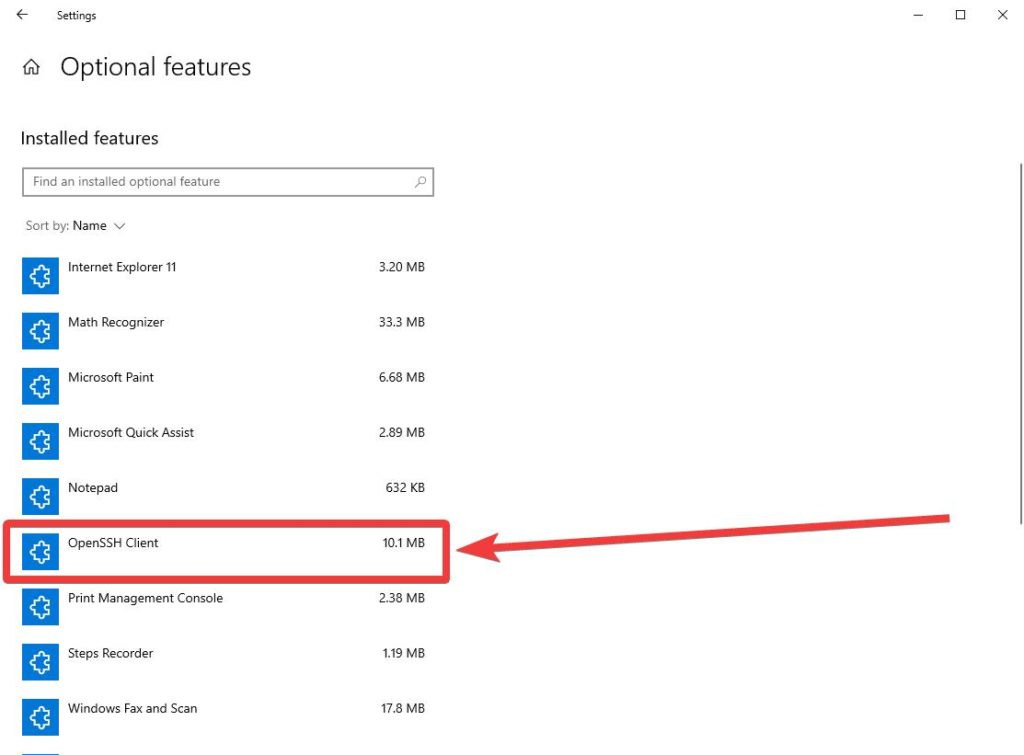 Şimdi openssh istemcisi yüklü özellikler altında bulunabilir.