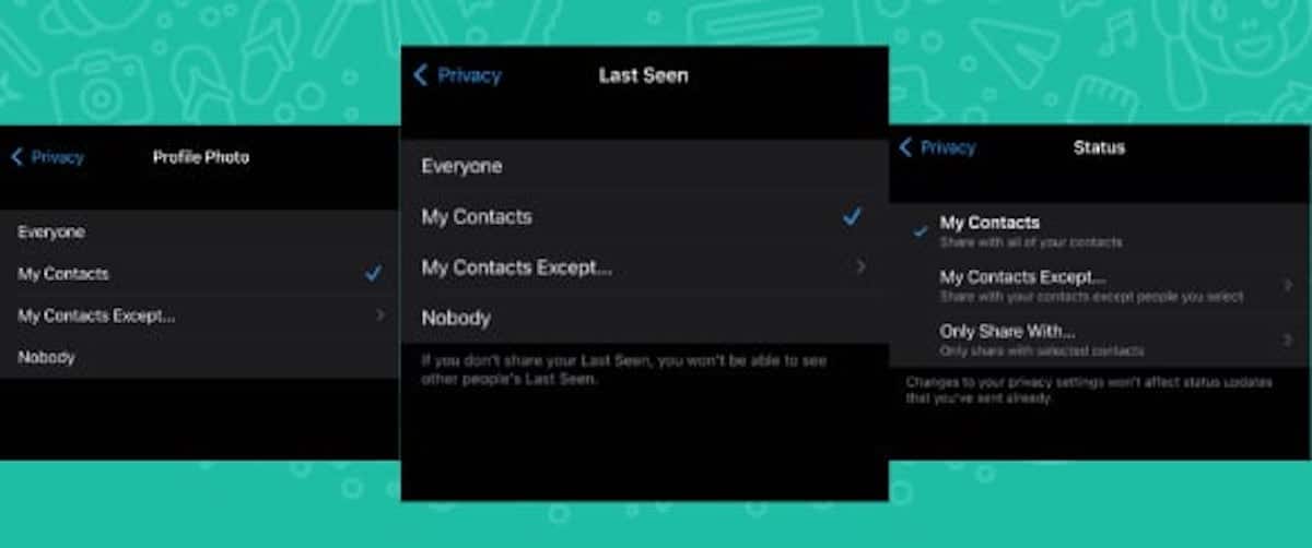 WhatsApp, kullanıcıların hangi kişilerin profil resimlerini, son görülen durumlarını ve bilgileri görüntüleyebileceğini kontrol etmeleri için yeni bir gizlilik ayarı getirdi. Daha önce, kullanıcılar yalnızca özel bilgileri herkesten, kişilerimden veya hiç kimseden gizleme seçeneğine sahipti.