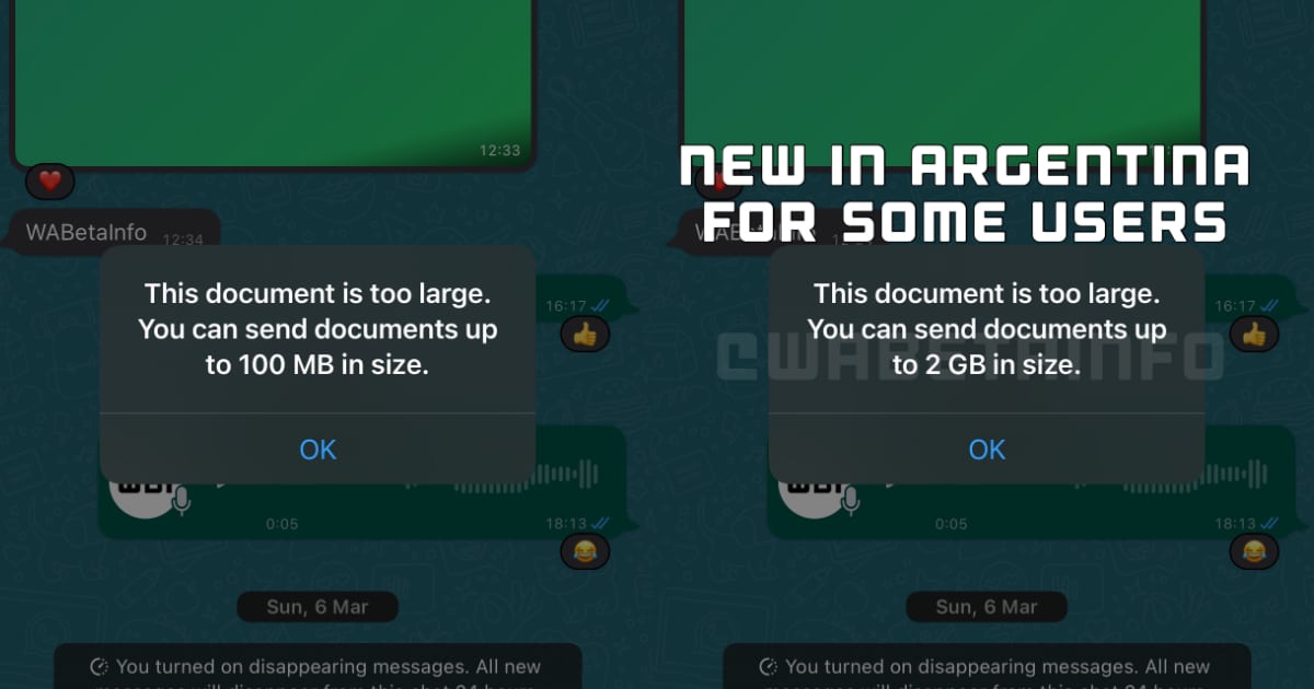 Yayın ayrıca, 2GB'a kadar medya dosyalarını paylaşma yeteneğinin, Arjantin'de Android için WhatsApp Beta'yı kullanan belirli beta test cihazları için de mevcut olduğunu doğrulamaktadır.