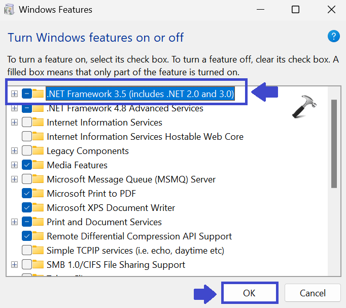 “.NET Framework 3.5” kutusunu kontrol edin. Tamam'ı tıklayın.