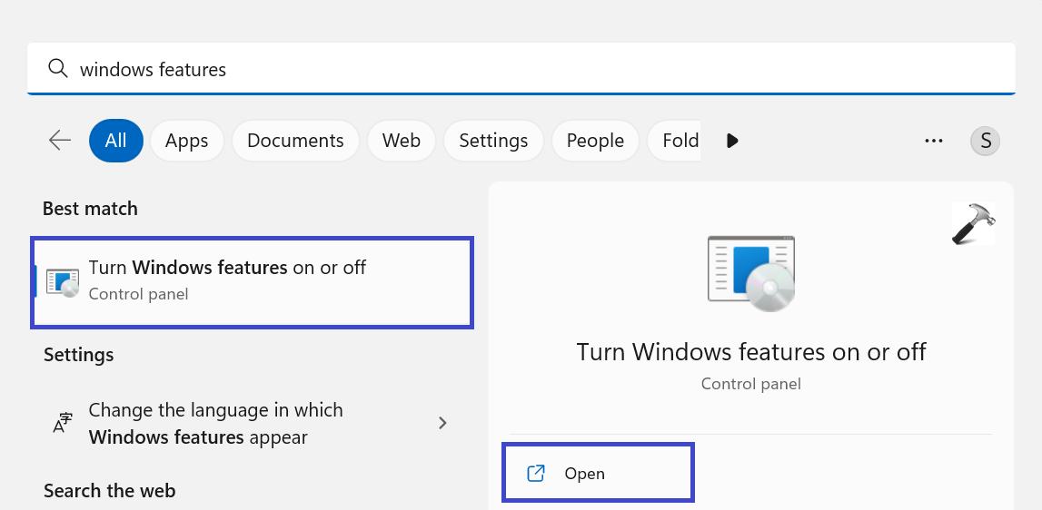 1. Windows tuşuna + s basın ve “Windows Özellikleri” ye tıklayın.