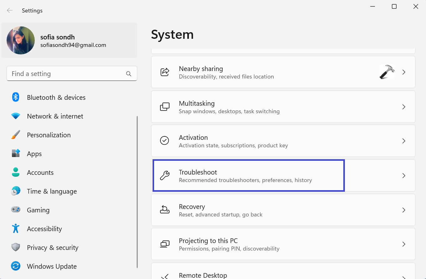 2. Şimdi, sağ panelden sorun giderme seçin.