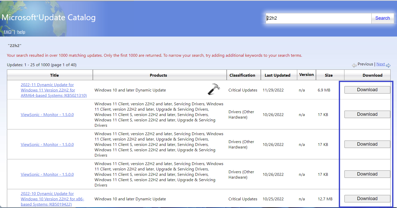 2. Şimdi,Microsoft Update Kataloğusayfa. KB ve bazı sayılarla başlamalıdır.