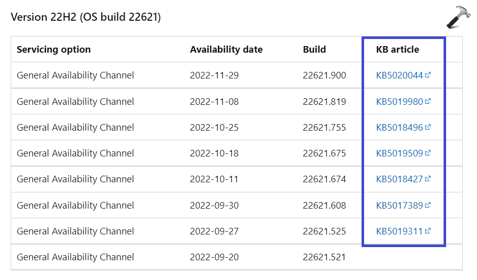 1. Güncelleme kodu numarasını bulmak için Microsoft'un güncelleme geçmişi web sitesini kontrol edin.