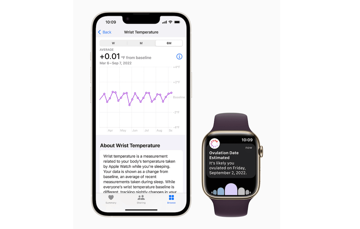 Ekran ve ekranın altında, yeni Apple Watch Serisi 8 ve Apple Watch Ultra Numune kullanıcılarının bilek sıcaklığının uyurken her beş saniyede bir bilek sıcaklığı ile güçlendirilir. Daha sonra, bu veriler gelişmiş algoritmalar tarafından, kullanıcıların yerleşik temel sıcaklıktan göreceli değişiklikler olarak görmesi için sağlık uygulamasında kaydedilen her gece bir toplam sağlamak için kullanılır.
