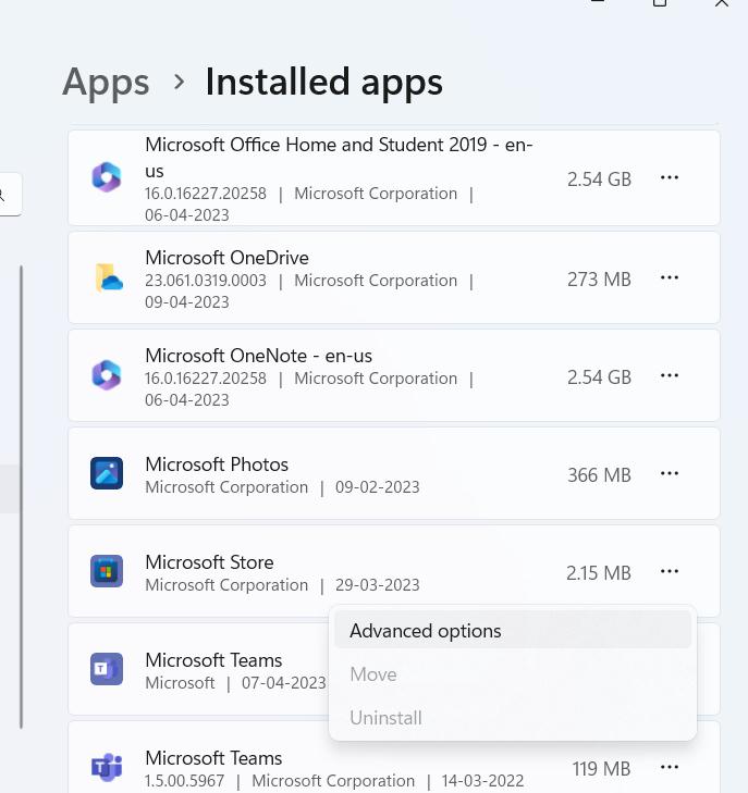 - Aşağı kaydır, bulMicrosoft Mağazası, üç yatay noktaya tıklayın ve üzerine tıklayınGelişmiş Seçenekler.