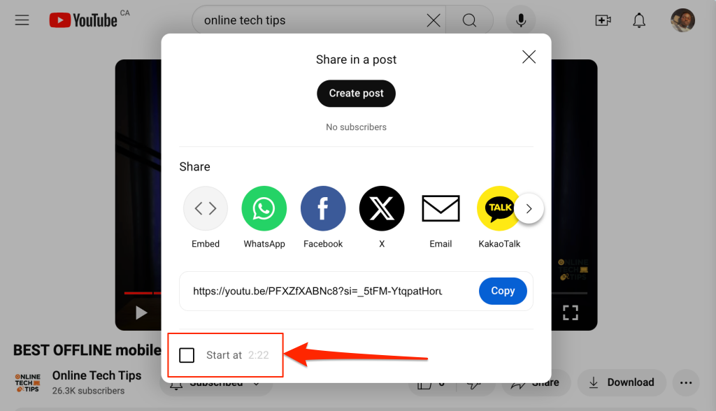İOS ve Android için YouTube uygulamasında zaman damgası geçişini bulacaksınız. Web tarayıcılarında, başlangıç zaman damgası, paylaşım sayfasının sol alt köşesindeki bir onay kutusudur.