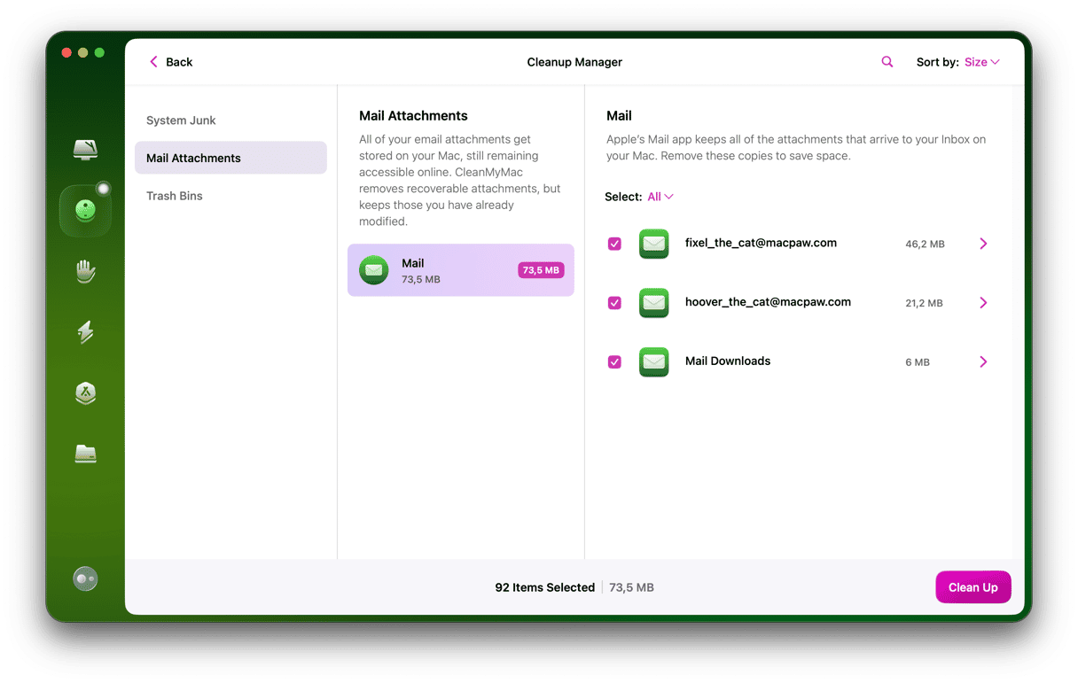 Onlara erişimi kaybetmeden bu ekleri Mac'inizden güvenli bir şekilde silebilirsiniz. E-posta sunucusunda saklanırlar ve gerektiğinde yeniden indirilebilirler. Alanları boşaltmak için ekleri avlamak, filtrelerle bile sıkıcı olabilir. Neyse ki, daha basit bir yol var. CleanMyMac'ın temizleme özelliği Mac'inizi tarar ve tüm ekleri bulur ve bunları alanı geri kazanmalarını sağlar. İşte nasıl kullanılacağı.