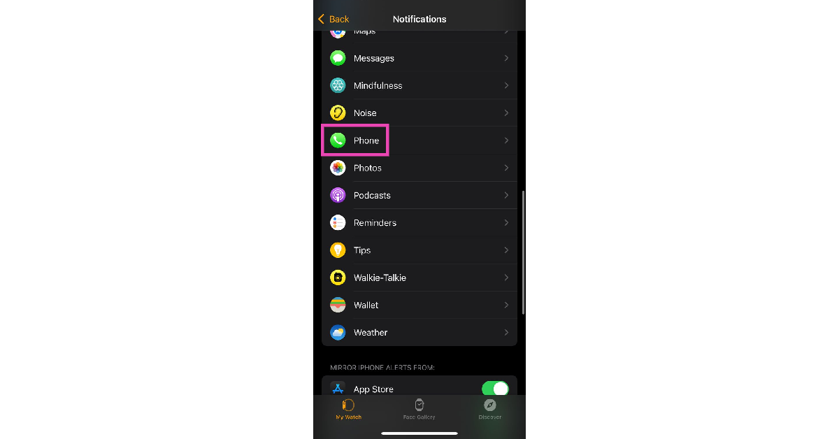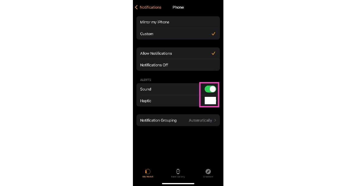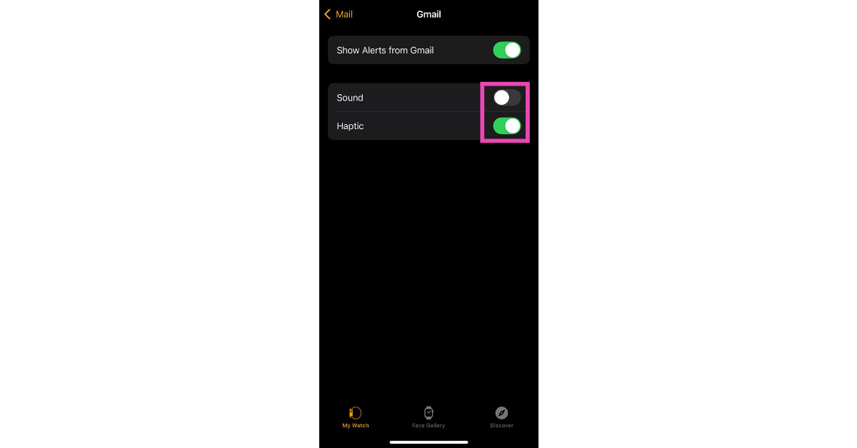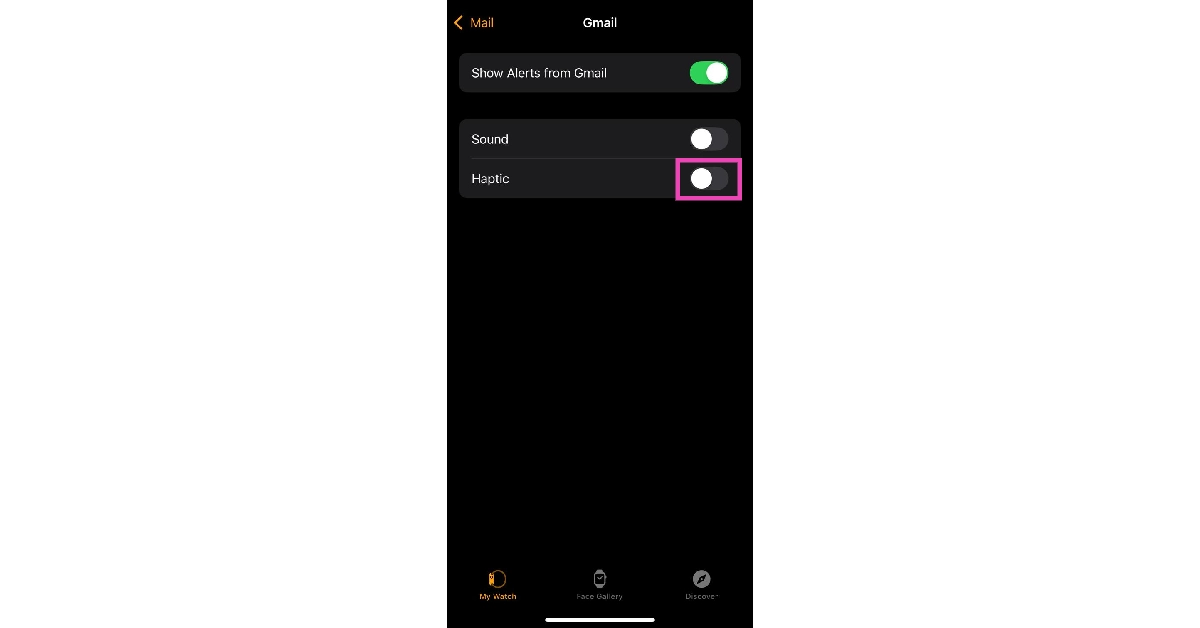 Belirli bir uygulamadan bildirimler için titreşim geri bildirimi istemiyorsanız, iPhone'unuzdaki Apple Watch uygulamasını başlatın ve bildirim ayarlarında söz konusu uygulamayı seçin. Gümrük'e dokunun ve geçiş anahtarını kapatınDokunsal.