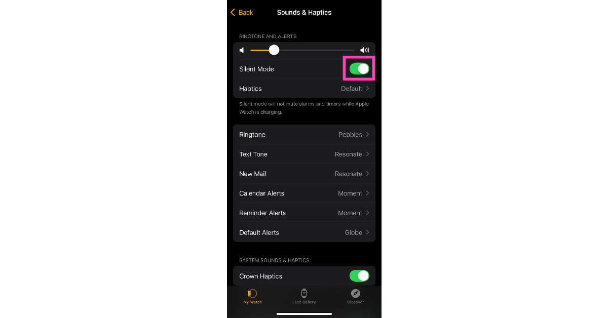 Apple Watch için herhangi bir ses uyarısı istemiyorsanız,Ayarlar> Ses ve AptikS ve sessiz mod için geçiş anahtarını açın. Bu dokunsal uyarıları kapatmaz.