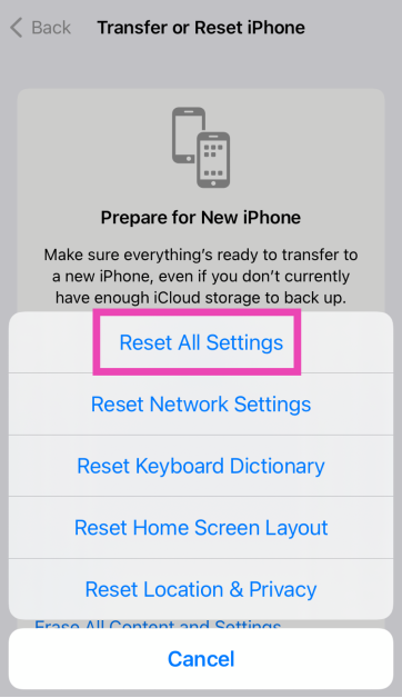 4. Adım:SeçmeTüm ayarları sıfırla. Girinparti koduKararınızı onaylamak için.